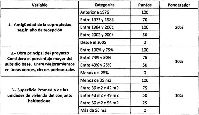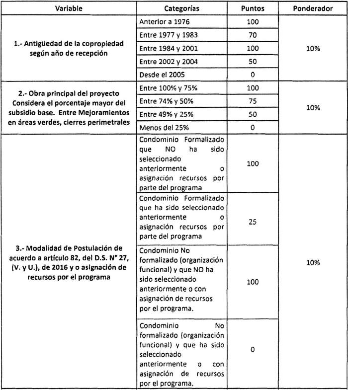 3° Defínanse los siguientes factores o criterios regionales de prelación, de acuerdo a lo dispuesto en el artículo 94, numeral 3, del DS N° 27 (V. y U.), de 2016 y su modificación, para Proyectos de Ampliación de Viviendas en Copropiedad, de acuerdo a uno o más factores constructivos, sociales, geográficos, económicos y/o culturales de relevancia, así como aquellos derivados de las orientaciones de la política general, para realizar la habilitación y selección de proyectos, que se detallan en la siguiente tabla: