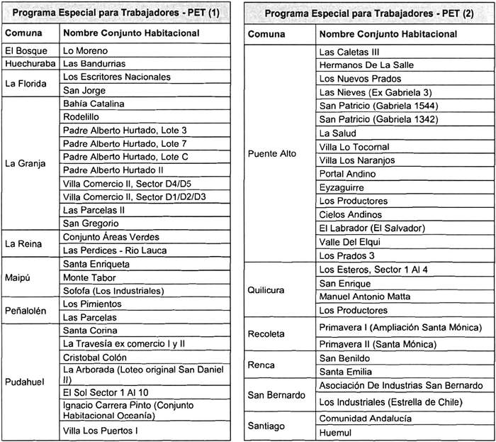 4.3 Que sean parte de los conjuntos habitacionales pertenecientes al Programa Especial de Trabajadores (PET), según el Catastro de Viviendas PET aportado por el Centro de Estudios de Ciudad y Territorio, Minvu, el que se indica a continuación: