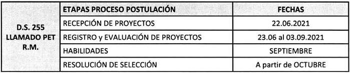 D.O. 27.09.2021 El presente llamado a concurso considera un proceso de selección, el cual será realizado por la Secretaría Regional Ministerial de Vivienda y Urbanismo (Seremi) de la Región Metropolitana mediante resolución, a partir del mes de octubre de 2021, si los proyectos cuentan con calificación Serviu; esto hasta que se acaben los recursos disponibles para el presente llamado. Se indican las fechas correspondientes en el siguiente cuadro: