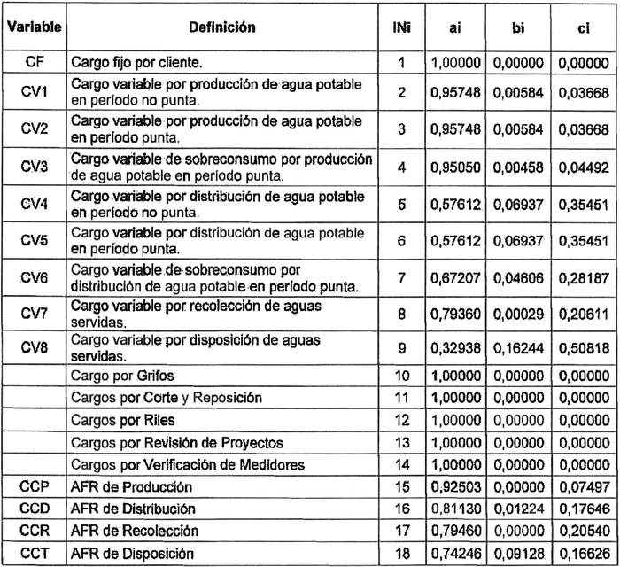 Se definen IN1, IN2, IN3, IN4, IN5, IN6, 1N7, IN8, IN9, IN10, IN11, IN12, IN13, IN14, IN15, IN16, IN17 e IN18; como los polinomios de indexación de tarifas. Se calculan utilizando la siguiente fórmula general:
