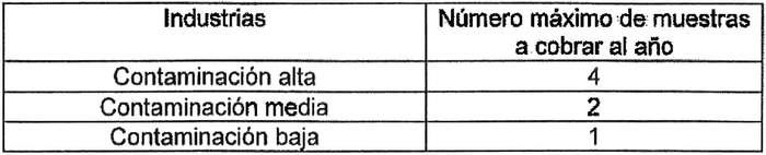 Los valores y número máximo de muestras a cobrar al año se han determinado de acuerdo a la clasificación de las industrias según el nivel de contaminación del efluente evacuado, cuya definición se indica a continuación: