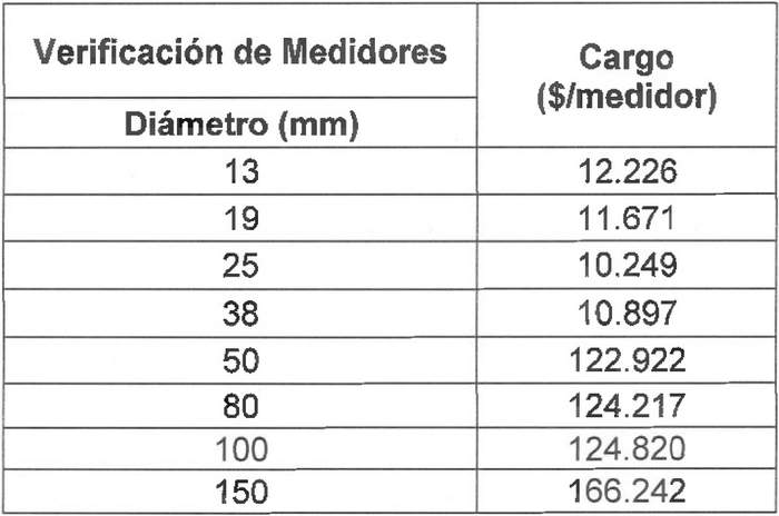 El prestador podrá cobrar por concepto de verificación de medidores el Cargo x IN14 de acuerdo a los siguientes valores: