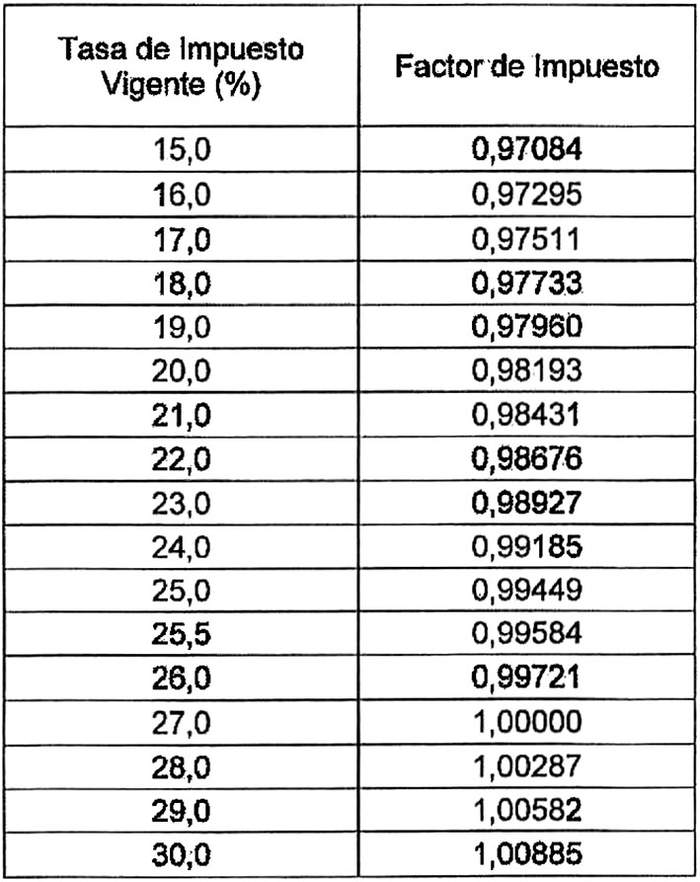 Los valores resultantes de la aplicación de los cargos anteriormente mencionados en este decreto, se incrementarán en función de la tasa de tributación vigente que grava las utilidades de las sociedades anónimas abiertas, considerando los factores para las tasas de tributación que se indican a continuación (tasas intermedias se interpolarán linealmente):