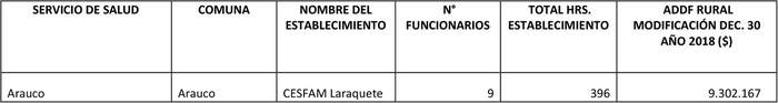 Artículo 3. Dispóngase el pago, por única vez, al Cesfam Laraquete, de la comuna de Arauco, correspondiente a la asignación de desempeño difícil rural del año 2018, de acuerdo a lo siguiente:
