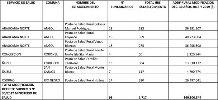 7. Que, mediante el decreto supremo Nº 14 de 2020, del Ministerio de Salud, se incorporaron como establecimientos rurales de desempeño difícil de atención primaria de salud, para el período 2018 a 2022, los siguientes: Posta de Salud Rural Colonia Manuel Rodríguez, Posta de Salud Rural Coyanco, Posta de Salud Rural Vegas Blancas, todas de la comuna de Angol, del Servicio de Salud Araucanía Norte; Posta de Salud Rural Puerto Norte Isla Santa María, de la comuna de Coronel, del Servicio de Salud Concepción; Posta de Salud Familiar Tanilvoro de la comuna de Coihueco y Posta de Salud Rural Monte Blanco de la comuna de San Carlos, ambos del Servicio de Salud Ñuble; y Posta de Salud Rural Huilma de la comuna de Río Negro, del Servicio de Salud Osorno, sumando un total de 1.717 horas.