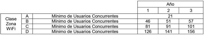 La cantidad mínima de Usuarios Concurrentes y su evolución durante todo el Período de Obligatoriedad de las Exigencias de las Bases comprometido y por Zona WiFi serán en relación a la clase de la Zona WiFi señalada en la primera tabla del numeral 1.1 del presente decreto, según se indican a continuación: