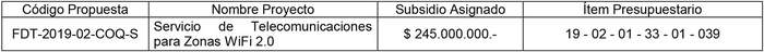 a) Lo solicitado por la interesada mediante ingresos Subtel Nº 270.614 y Nº 270.617, ambos de fecha 28.10.2020, para el Área de Postulación Coquimbo Sur, Código: FDT-2019-02-COQ-S, del Concurso Público "Servicios de Telecomunicaciones para Zonas WiFi 2.0", Código: FDT-2019-02, cuya Propuesta consta de los ingresos Subtel señalados en los literales j) y k) de los Vistos.
