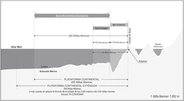 (9) El área terrestre continental americana de Chile tiene una superficie aproximada de 755.776 mil Km2. El Mar Territorial (M.T.) asociado a este territorio tiene una superficie de 128.090,68 Km2, y la Zona Económica Exclusiva (Z.E.E.), en donde se ejercen derechos de soberanía sobre los recursos del agua, suelo y subsuelo hasta las 200 mn de costa tiene una superficie de 2.009.299 Km2 (esto no incluye la ZEE generada por territorios insulares en el Océano Pacífico). Además, basado en estudios de batimetría, sísmicos y de sedimentos, nuestro país tiene el derecho a reclamar una zona de Plataforma Continental Extendida hasta 350 mn desde las líneas de base a partir de las cuales se mide la anchura del Mar Territorial o hasta la isóbata de los 2500 metros más 100 mn de conformidad al artículo 76 de la CONVEMAR.