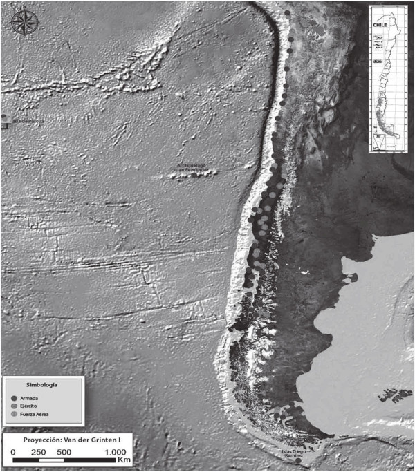 (61) El despliegue de las FF.AA. en el territorio nacional incluye las siguientes unidades principales: Ejército de Chile: 6 Divisiones, 2 Brigadas y 37 regimientos; Armada de Chile: 5 Zonas Navales, 5 Bases Navales, 4 Destacamentos de Infantería de Marina, 16 Gobernaciones Marítimas y 60 Capitanías de Puerto; Fuerza Aérea de Chile: 5 Brigadas Aéreas, 14 Bases Aéreas y 2 Destacamentos.