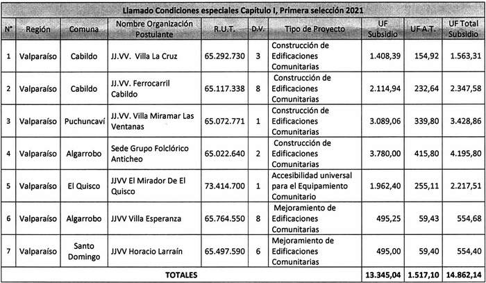 MEDIANTE LA RESOLUCIÓN Nº 724 EXENTA, DE FECHA 26 DE MAYO DEL AÑO 2021, SE DISPUSO LA ASIGNACIÓN DE RECURSOS PARA LA REGIÓN DE VALPARAÍSO Y APRUEBA NÓMINA DE POSTULANTES SELECCIONADOS EN PRIMER PROCESO DE SELECCIÓN DEL LLAMADO EN CONDICIONES ESPECIALES, PARA PROYECTOS DEL CAPÍTULO PRIMERO, EQUIPAMIENTO COMUNITARIO, DEL PROGRAMA DE MEJORAMIENTO DE VIVIENDAS Y BARRIOS, REGULADO POR EL DS Nº 27 (V. Y U.), DE 2016, DIRIGIDO A ORGANIZACIONES COMUNITARIAS Y JUNTAS DE VECINOS, REGIDAS POR LA LEY Nº 19.418