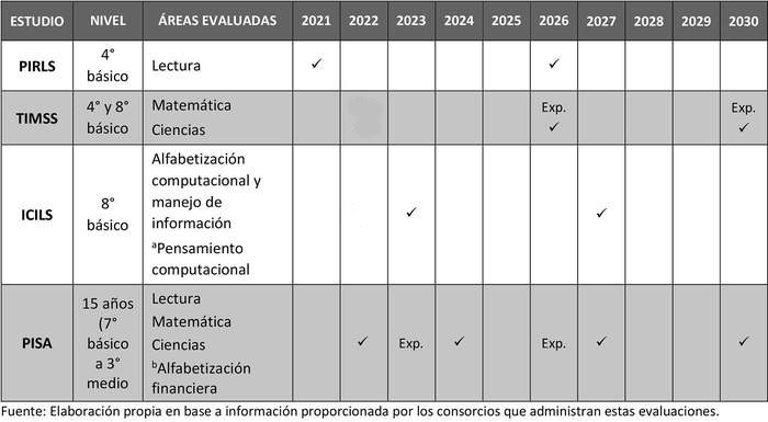 Cada uno de estos estudios tiene un ciclo de aplicación: PIRLS, 5 años; TIMSS, 4 años; ICILS, 5 años ; PISA, 3 años y OCDE, 4 años. Cada uno requiere de una aplicación experimental y una aplicación definitiva, las que son presentadas en la siguiente tabla: