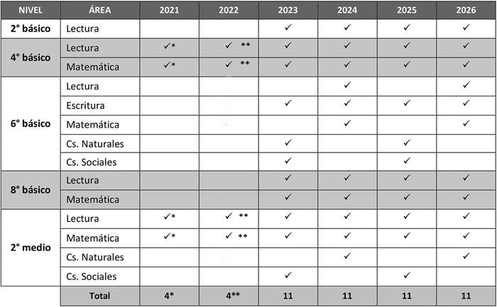 En lo relativo a la comparabilidad, la cantidad y frecuencia de las evaluaciones censales debe permitir que todos los establecimientos sean evaluados en al menos uno de sus niveles en básica y uno de sus niveles en media todos los años, de forma que anualmente se pueda contar con información nueva para su categorización. Esto se aplica tanto para los establecimientos que cuentan con todos los niveles en enseñanza básica y media, como para los que cuentan con solo algunos de los niveles de alguno de sus ciclos, por ejemplo, aquellos que comienzan en 7º básico.