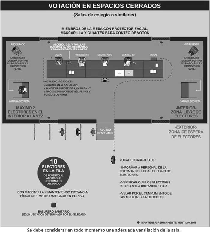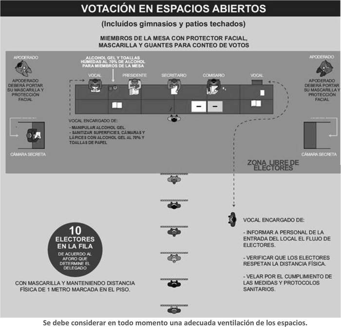 - Se recomienda que los locales de votación tengan habilitadas puertas de ingreso y salida distintas, para permitir el flujo unidireccional y evitar aglomeraciones.