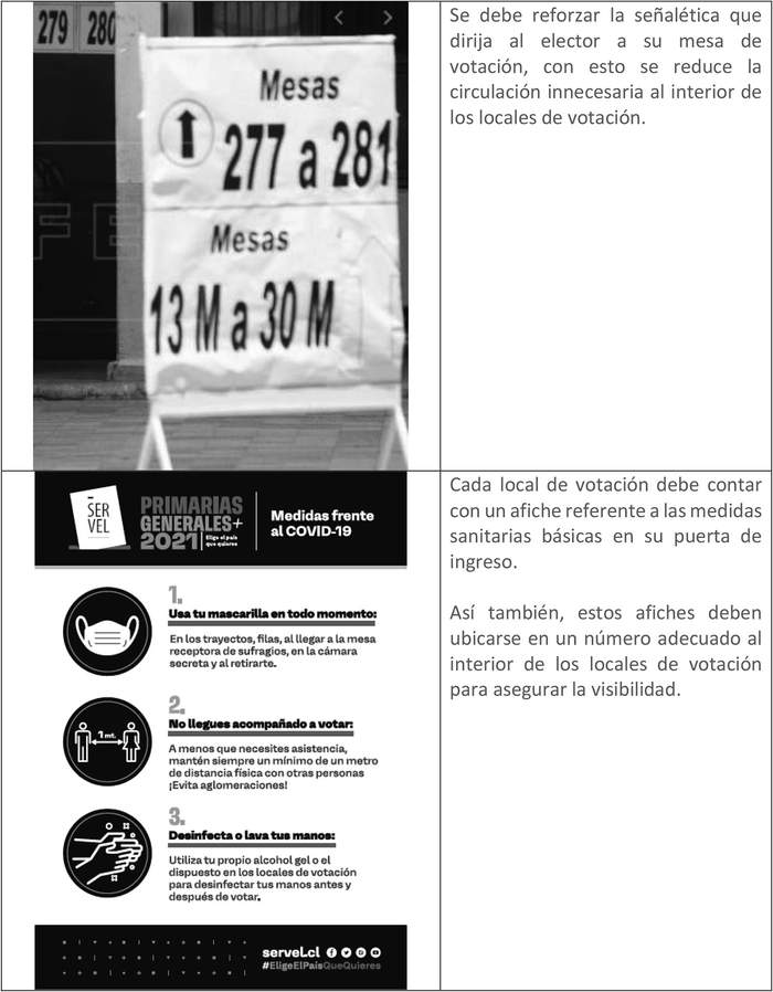 - Tanto en el exterior como en el interior de los locales de votación, se deben colocar afiches que orienten al elector sobre medidas sanitarias, entradas y salidas.