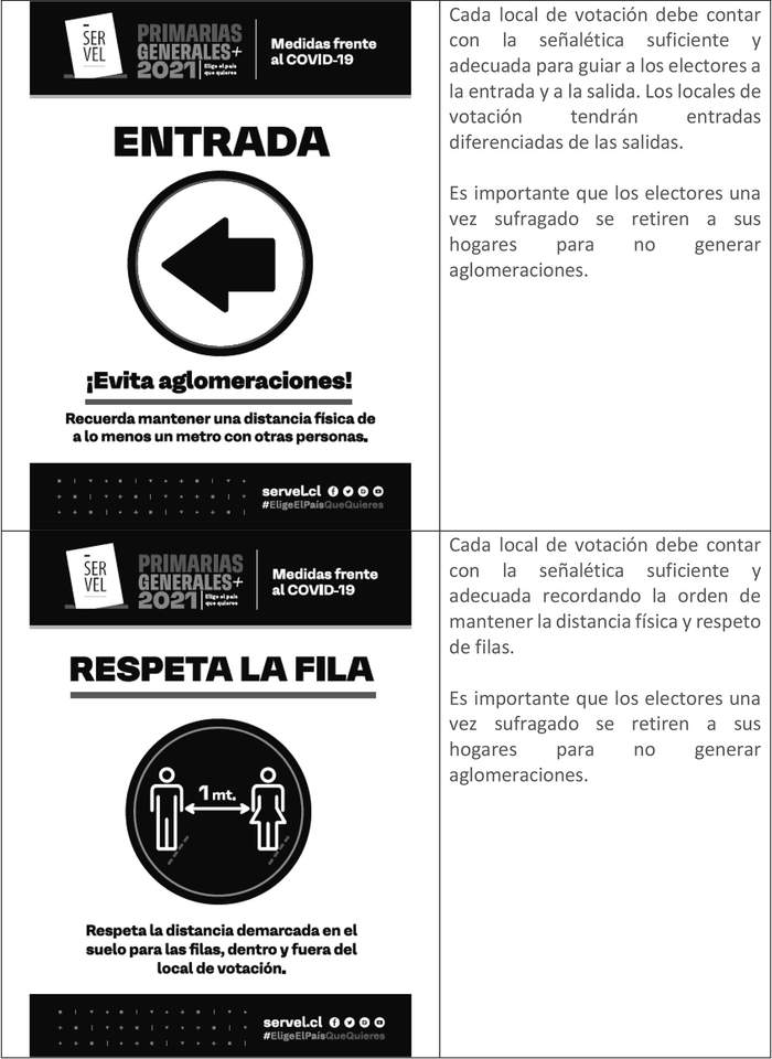 - Una vez emitido el voto, los electores tendrán que hacer abandono inmediato del local de votación por la salida dispuesta para ello. Es importante procurar impedir los contactos sociales, conversaciones y saludos en el interior del recinto de votación. Las declaraciones, entrevistas o conferencias de prensa de cualquier persona deberán ser realizadas afuera de los locales de votación, de conformidad con las normas e instrucciones dictadas por el Consejo Directivo del Servicio Electoral para las Elecciones Primarias Presidenciales 2021.
