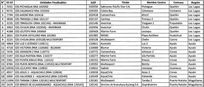 Primero: Reemplácese el Anexo 1 de la "Instrucción General para la Implementación de un Sistema de Monitoreo Continuo en Centros de Engorda de Salmones (CES)", aprobada mediante la resolución exenta Nº 2.019, de 8 de octubre de 2020, de la SMA, por la tabla del Anexo 1 a continuación: