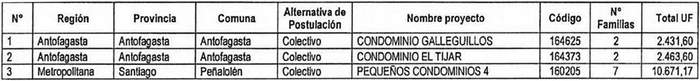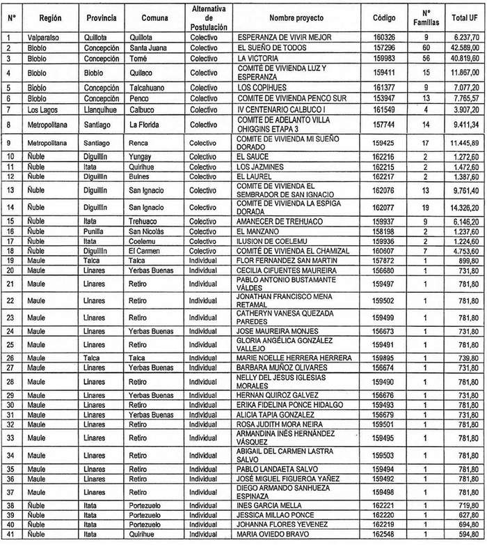 2. Apruébase la siguiente nómina de proyectos colectivos e individuales seleccionados, con su respectivo financiamiento total, para el otorgamiento de subsidios del Programa Habitacional Fondo Solidario de Elección de Vivienda, incluyendo los servicios de asistencia técnica y fiscalización técnica de obras, para proyectos de Construcción en Sitio Propio, modalidad de postulación colectiva, en las regiones de Valparaíso, Ñuble, Biobío, Los Lagos y Metropolitana y modalidad de postulación individual en la región de Maule y Ñuble; y para proyectos de pequeños condominios en las Regiones de Antofagasta y Metropolitana, correspondiente al proceso de selección cuyo cierre de postulación se efectuó el día 29 de abril de 2021, en el llamado efectuado por resolución exenta Nº 446 (V. y U.), de 2021: