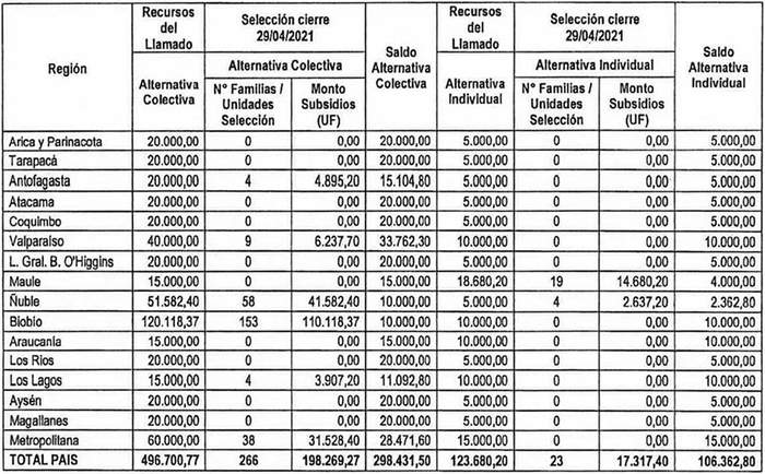 4. Los recursos comprometidos en los Resuelvos 2. y 3. de la presente resolución, para los proyectos seleccionados en el concurso que se llamó por resolución exenta Nº 446 (V. y U.), de 2021, cuyo cierre de postulación se efectuó el día 29 de abril de 2021, se resumen en el siguiente cuadro para cada región del país, incluyendo la suma total de familias beneficiadas y Unidades de Fomento comprometidas, considerando los montos de subsidio de los proyectos, incluidos sus respectivos servicios de asistencia técnica y fiscalización técnica de obras, según alternativa de postulación: