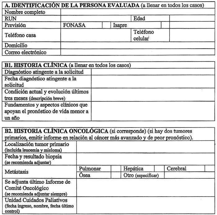 - Finalmente, se incorporan después del cuerpo del nuevo Capítulo, los Anexos denominados "CERTIFICADO PARA SOLICITUD DE BENEFICIOS COMO ENFERMO TERMINAL Ley N°21.309" y "AUTORIZACIÓN A CONSEJO MÉDICO O A CONSEJO MÉDICO DE APELACIÓN PARA REVISIÓN DE FICHA CLÍNICA", que se adjuntan a la presente circular.