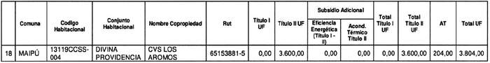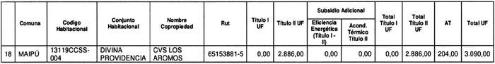 1. Reemplácese en el Resuelvo Nº 1 de la resolución exenta Nº 2.398, de fecha 30 de septiembre de 2019, de esta Secretaría Ministerial, en el sentido de sustituir en la tabla inserta, las siguientes filas correspondientes a la copropiedad: "CVS Los Aromos" del conjunto Divina Providencia de la comuna de Maipú, en la forma que se indica a continuación: