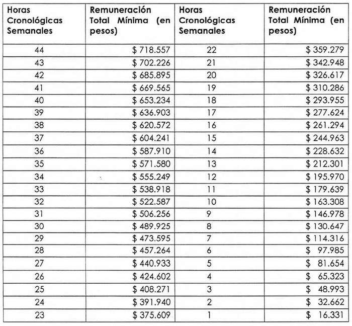 Artículo segundo: Establécese la siguiente tabla de cálculo de la Remuneración Total Mínima en pesos, correspondiente al año 2021, para aquellos profesionales de la educación que tengan una designación o contrato inferior a 44 horas cronológicas semanales:
