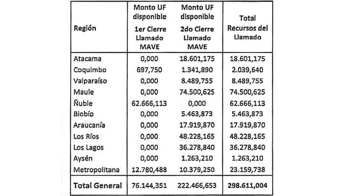 D.O. 14.03.2022 Los recursos involucrados en la selección ascienden a un total de 298.611,004 UF y su distribución nacional será la siguiente: