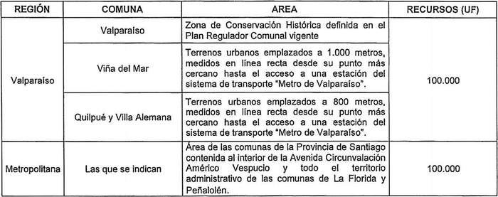 Los terrenos ubicados en las áreas de la Región de Valparaíso, definidas en el Resuelvo 2., y las comunas de Santiago, Estación Central, Independencia, Lo Prado, Macul, Ñuñoa, Pedro Aguirre Cerda, Providencia, Quinta Normal, Recoleta, San Joaquín y San Miguel, en la Región. Metropolitana, obtendrán este subsidio cumpliendo solamente con la condición señalada en el numeral i. precedente.
