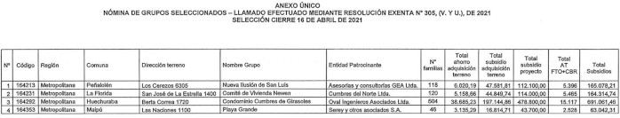 2. Apruébase la selección de los grupos organizados indicados en la siguiente tabla, con su respectivo financiamiento total, el cual incluye los servicios de asistencia técnica, fiscalización técnica de obras y aranceles del Conservador de Bienes Raíces que se detallan en el resuelvo 4., para el otorgamiento de subsidios del Programa Habitacional Fondo Solidario de Elección de Vivienda en la alternativa de postulación colectiva, para adquisición de terrenos y desarrollo de proyectos de Construcción en Nuevos Terrenos, en la Región Metropolitana, correspondiente al proceso de selección cuyo cierre de postulación se efectuó el día 16 de abril de 2021, del llamado efectuado por resolución exenta Nº 305 (V. y U.), de 2021, y sus modificaciones: