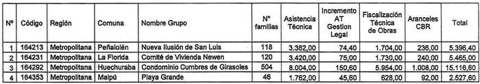 4. Asígnase a los grupos organizados seleccionados en el resuelvo 2. precedente, por concepto de pago por los Servicios de Asistencia Técnica, por las Labores de Fiscalización Técnica de Obra y pago de Aranceles al Conservador de Bienes Raíces para el desarrollo de sus proyectos, los montos expresados en Unidades de Fomento que se detallan a continuación: