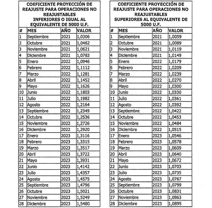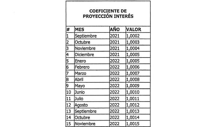 5º.- Estos coeficientes regirán para los efectos de calcular el monto adicional correspondiente a la proyección de reajuste y/o de interés de aquellas boletas bancarias de garantía cuya emisión se practique entre el 16 de agosto de 2021 hasta el 15 de septiembre de 2021, inclusive.