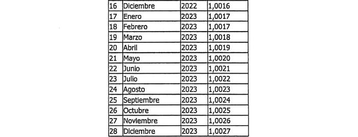2º.- Fíjanse los coeficientes que a continuación se indican, según mes de vencimiento, para la proyección de intereses de las boletas bancarias de garantía a que se refiere el DS Nº 40 (V. y U.), de 2004, solo respecto de los llamados y actuaciones efectuados conforme a sus disposiciones, las que continuarán aplicándose hasta su total extinción, de acuerdo con lo dispuesto en los incisos primero y segundo del artículo 75 del DS N° 1 (V. y U.), de 2011, que lo derogó; el DS Nº 174 (V. y U.), de 2005; el DS Nº 1 (V. y U.), de 2011; el DS Nº 49 (V. y U.), de 2011; el DS Nº 255 (V. y U.), de 2006; el DS Nº 4 (V. y U.), de 2009; el DS Nº 145 (V. y U.), de 2007, sólo respecto de los llamados y actuaciones efectuados conforme a sus disposiciones, las que continuarán aplicándose hasta su total extinción, de acuerdo a lo establecido en el artículo 2º transitorio del DS Nº 3 (V. y U.), de 2010, que lo derogó; el DS Nº 62 (V. y U.), de 1984; el DS Nº 140 (V. y U.), de 1990, en sus artículos 16 y 19; el DS Nº 135 (V. y U.), de 1986, en su artículo 9°; sea que dichas boletas de garantía estuvieren expresadas en Unidades de Fomento o en pesos, moneda nacional.