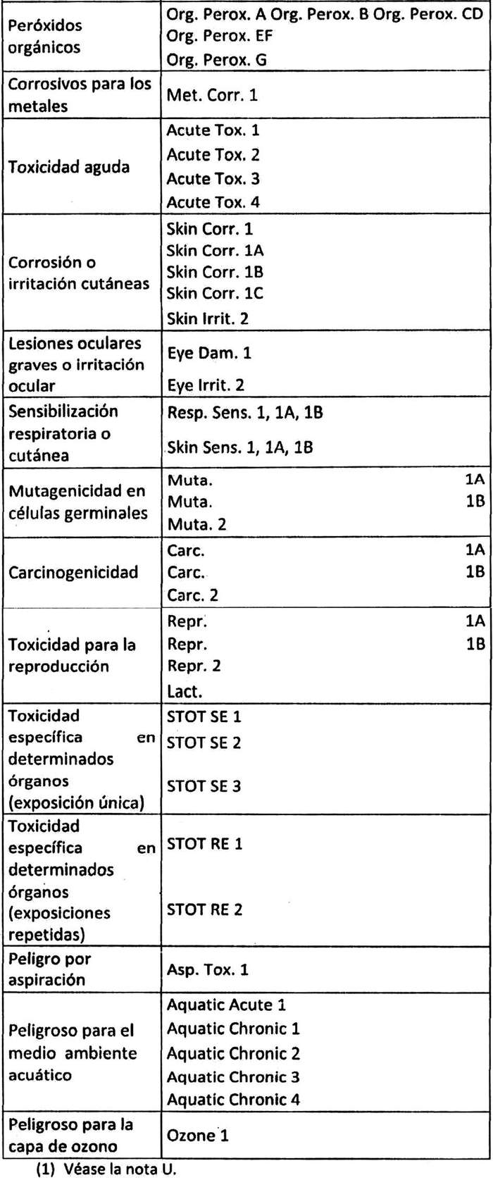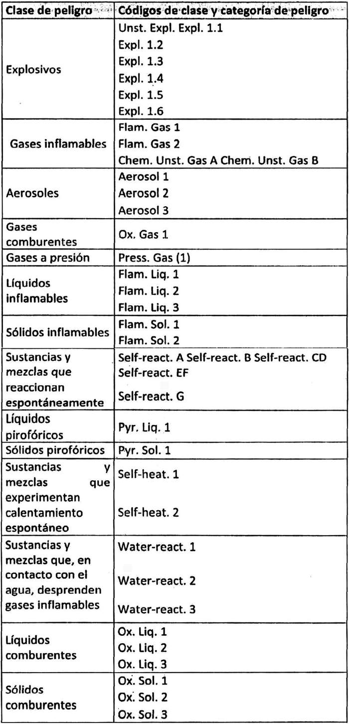 Tabla Nº 1. Códigos de clase y categorías de peligros