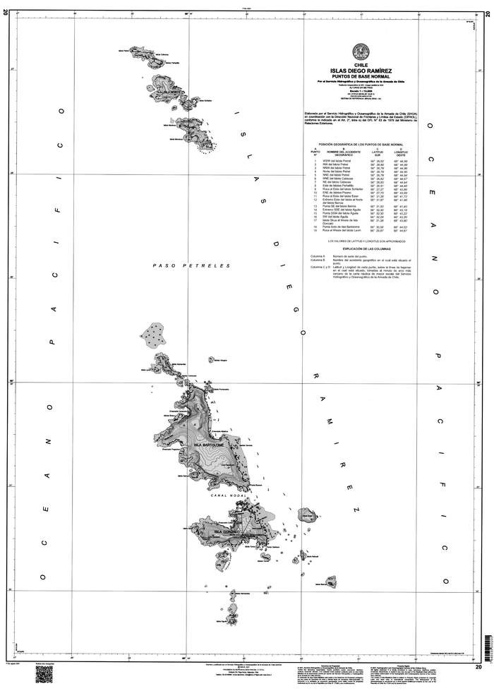 * Mapa Carta S.H.O.A. Nº 20, de 2021, "Islas Diego Ramírez, Posición Geográfica de los Puntos de Base Normal", escala 1:12.000, del Servicio Hidrográfico y Oceanográfico de la Armada, en página 3.