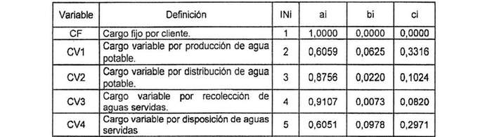 A continuación se indican los valores de ai, bi y ci, para el respectivo INi:
