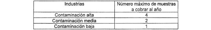 Los valores y número máximo de muestras a cobrar al año se han determinado de acuerdo a la clasificación de las industrias según el nivel de contaminación del efluente evacuado, cuya definición se indica a continuación: