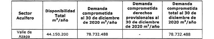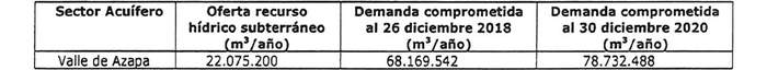 12. Que, por otro lado, corresponde hacer presente que, al 26 de diciembre de 2018, la demanda comprometida de derechos de aprovechamiento definitivos en el sector hidrogeológico de aprovechamiento común de Valle de Azapa, era de 68.169.542 metros cúbicos anuales. Sin embargo, luego de la actualización del balance del sector se determinó que la demanda comprometida de derechos definitivos, al 30 de diciembre de 2020, asciende a un volumen de 78.732.488 metros cúbicos anuales, mostrándose un incremento de 10.562.946 metros cúbicos anuales, según se aprecia en la siguiente Tabla: