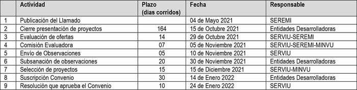 Los plazos señalados para la "Evaluación de oferta", "Comisión Evaluadora", "Envío de Observaciones" y "Selección de proyectos" serán referenciales y los plazos por "Suscripción Convenio" y "Resolución que aprueba el Convenio" son estimativos, ya que se determinarán según el artículo 14º del DS Nº 19 (V. y U.), de 2016, y sus modificaciones.