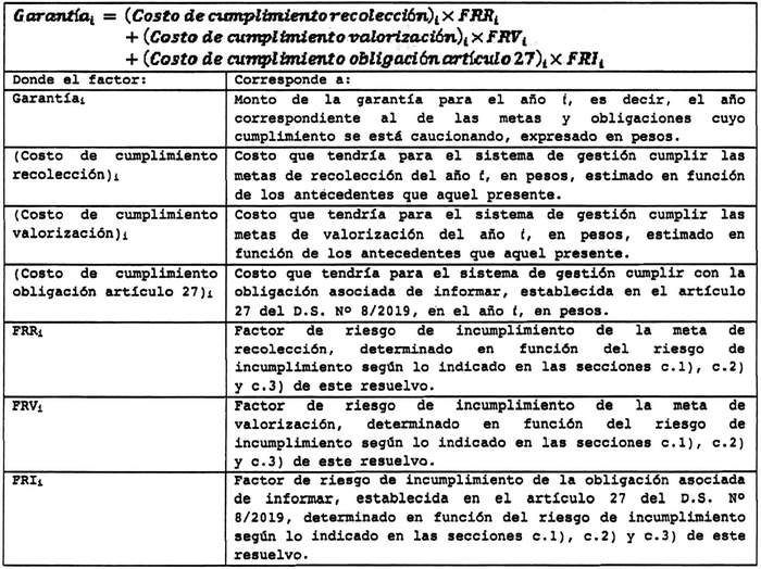Los factores de riesgo para recolección y valorización serán calculados en base a la recolección y la valorización efectiva acreditadas por el sistema de gestión el año anterior y las metas de recolección y valorización cuyo cumplimiento debe caucionar el sistema de gestión para el año en que presenta la garantía, de acuerdo con las fórmulas señaladas en las Tablas 9 y 10.