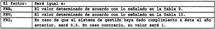 Tabla 11: Factores de riesgo de incumplimiento después del año de entrada en vigencia de las metas, para sistemas de gestión nuevos
