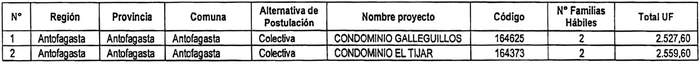 i. Reemplázase en la tabla de pequeños condominios, inserta en su Anexo Único, en su fila N° 1, correspondiente a la Región de Antofagasta, proyecto Condominio Galleguillos, código 164625, los siguientes montos, según las columnas que se identifican a continuación: