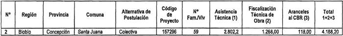 f. Reemplázase en la primera tabla inserta en su Anexo Único, en su fila N° 2, correspondiente a la Región de Biobío, proyecto El Sueño de Todos, código 157296, los siguientes montos, según las columnas que se identifican a continuación: