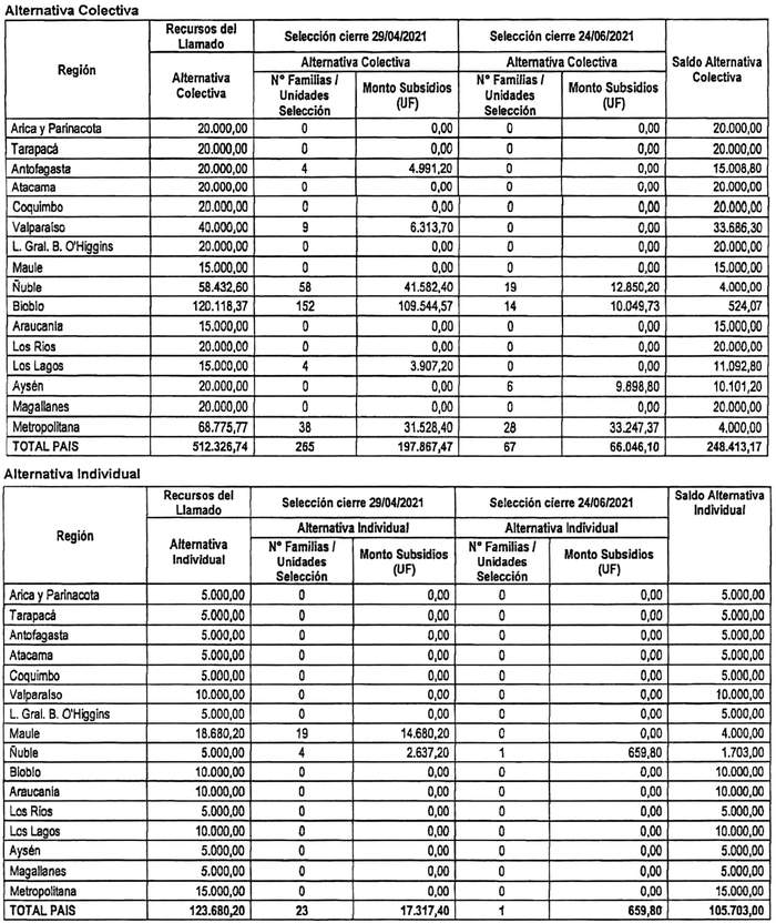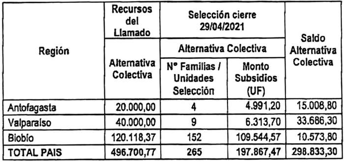 5. Los recursos comprometidos en los Resuelvos 3. y 4. de la presente resolución, para los proyectos seleccionados en el concurso que se llamó por resolución exenta N° 446 (V. y U.), de 2021, cuyo cierre de postulación se efectuó el día 24 de junio de 2021, se resumen en el siguiente cuadro para cada región del país, incluyendo la suma total de familias beneficiadas y Unidades de Fomento comprometidas, considerando los montos de subsidio de los proyectos, incluidos sus respectivos servicios de asistencia técnica y fiscalización técnica de obras, según alternativa de postulación: