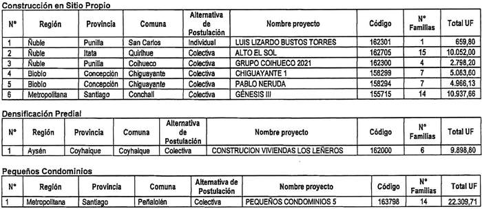 3. Apruébase la siguiente nómina de proyectos seleccionados para el otorgamiento de subsidios del Programa Habitacional Fondo Solidario de Elección de Vivienda, con su respectivo financiamiento total, incluyendo los servicios de asistencia técnica y fiscalización técnica de obras, correspondientes a: 6 proyectos en la modalidad de Construcción en Sitio Propio, 5 de ellos postulados de manera colectiva en las regiones de Ñuble, Biobío y Metropolitana y 1 proyecto postulado de manera individual en la Región de Ñuble; 1 proyecto en la modalidad de Densificación Predial, postulado de manera colectiva, en la Región de Aysén y 1 proyecto en la modalidad de Pequeños Condominios en la Región Metropolitana, correspondiente al proceso de selección cuyo cierre de postulación se efectuó el día 24 de junio de 2021, en el llamado efectuado por resolución exenta N° 446 (V. y U.), de 2021: