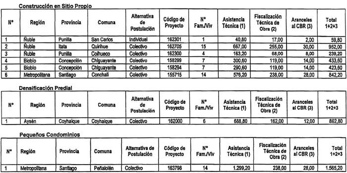 b. Reemplázase en la tabla inserta en su Resuelvo 2., pequeños condominios, su fila N° 1 y 2, por las siguientes: