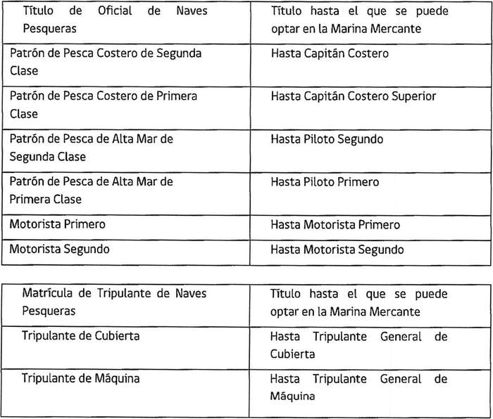 Cumplidos los requisitos anteriores, podrán optar al título de oficial o tripulante de la Marina Mercante Nacional que corresponda, de acuerdo con la siguiente tabla: