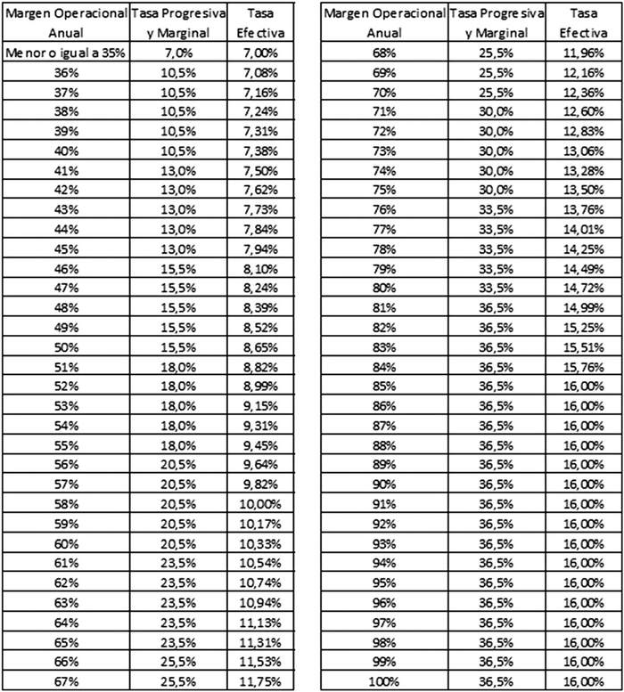 El pago específico anual que deberá pagar el Contratista al Estado de Chile, equivale al valor que resulta de multiplicar la utilidad operacional anual para pago específico, por la tasa efectiva (función del margen operacional anual; variable en forma progresiva y marginal según los valores expresados en la Tabla 1).