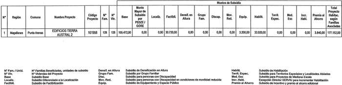 4. Los recursos comprometidos en el Resuelvo 2. precedente, para el proyecto seleccionado en el llamado realizado mediante la resolución exenta N° 352 (V. y U.), de 2021, cuyo cierre de postulación se efectuó el día 29 de abril de 2021, se señala en el siguiente cuadro para la Región de Magallanes y de la Antártica Chilena, incluyendo la suma total de familias beneficiadas y las Unidades de Fomento comprometidas, considerando los montos de subsidio del proyecto, incluido sus respectivos servicios de asistencia técnica y fiscalización técnica de obras y recursos disponibles para las otras regiones convocadas en el Llamado a proceso de selección: