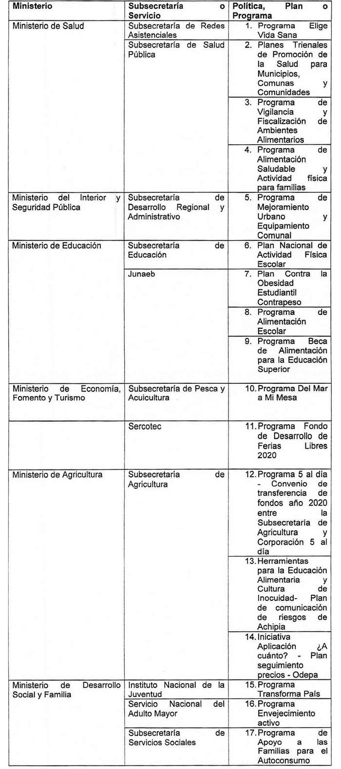 Que, por su parte, de conformidad a lo dispuesto en el inciso primero del artículo 7º de la ley Nº 20.670, el Presidente de la República, anualmente, determinará las políticas, planes y programas que, cumpliendo con los requisitos previstos en el artículo 6º de la referida ley, formarán parte del Sistema. Lo anterior, previa propuesta del Comité Interministerial de Desarrollo Social y Familia, regulado en la ley Nº 20.530, e informe de la Secretaría Ejecutiva Elige Vivir Sano, elaborado para dicho Comité.