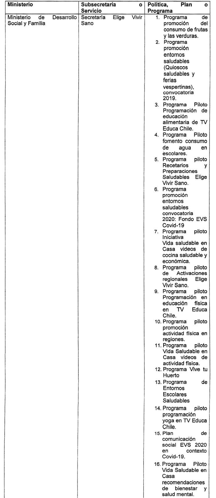 Lo dispuesto en el decreto con fuerza de ley Nº 1/19.653, del Ministerio Secretaría General de la Presidencia, de 2000, que fija el texto refundido, coordinado y sistematizado de la Ley Nº 18.575, Orgánica Constitucional de Bases Generales de la Administración del Estado; en la Ley Nº 19.880, del Ministerio Secretaría General de la Presidencia, que Establece Bases de los Procedimientos Administrativos que rigen los Actos de los Órganos de la Administración del Estado; en la Ley Nº 20.530, que el Crea el Ministerio de Desarrollo Social y Familia y modifica cuerpos legales que indica; en el decreto supremo Nº 15, de 2012, del Ministerio de Desarrollo Social, Subsecretaría de Evaluación Social, que aprueba el Reglamento del artículo 4º de la ley Nº 20.530 sobre la estructura organizativa interna del Ministerio de Desarrollo Social; en la Ley Nº 20.670, del Ministerio de Desarrollo Social, Subsecretaría de Servicios Sociales, que crea Sistema Elige Vivir Sano; en el decreto Nº 67, de 2013 Aprueba reglamento del artículo 3º de la Ley Nº 20.670, que crea el Sistema Elige Vivir Sano; en la Ley Nº 21.192, de Presupuestos del Sector Público correspondiente al año 2020; en el Acta de Sesión del Comité Interministerial de Desarrollo Social y Familia, de fecha 27 de septiembre de 2019; en el decreto supremo Nº 104, de 2020 del Ministerio de Interior y Seguridad Pública que Declara Estado de Excepción Constitucional de Catástrofe, por calamidad pública en el territorio de Chile; en el decreto Nº 646, de 2020, del Ministerio del Interior y Seguridad Pública, que prorroga declaración de estado de excepción constitucional de catástrofe, por calamidad pública, en el territorio de Chile, y reemplaza a los Jefes de la Defensa Nacional, según se indica, y en la resolución Nº 7, de 2019, de la Contraloría General de la República, que fija Normas sobre Exención del Trámite de Toma de Razón.
