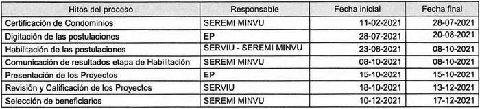 1. Modifíquese los plazos correspondientes a los procesos y fases de postulación y selección del llamado, establecidos en el resuelvo Nº 2 de la resolución exenta Nº 336 de fecha 1 de abril de 2021 de la Secretaría Regional Ministerial de Vivienda y Urbanismo de la Región Metropolitana, por los siguientes: